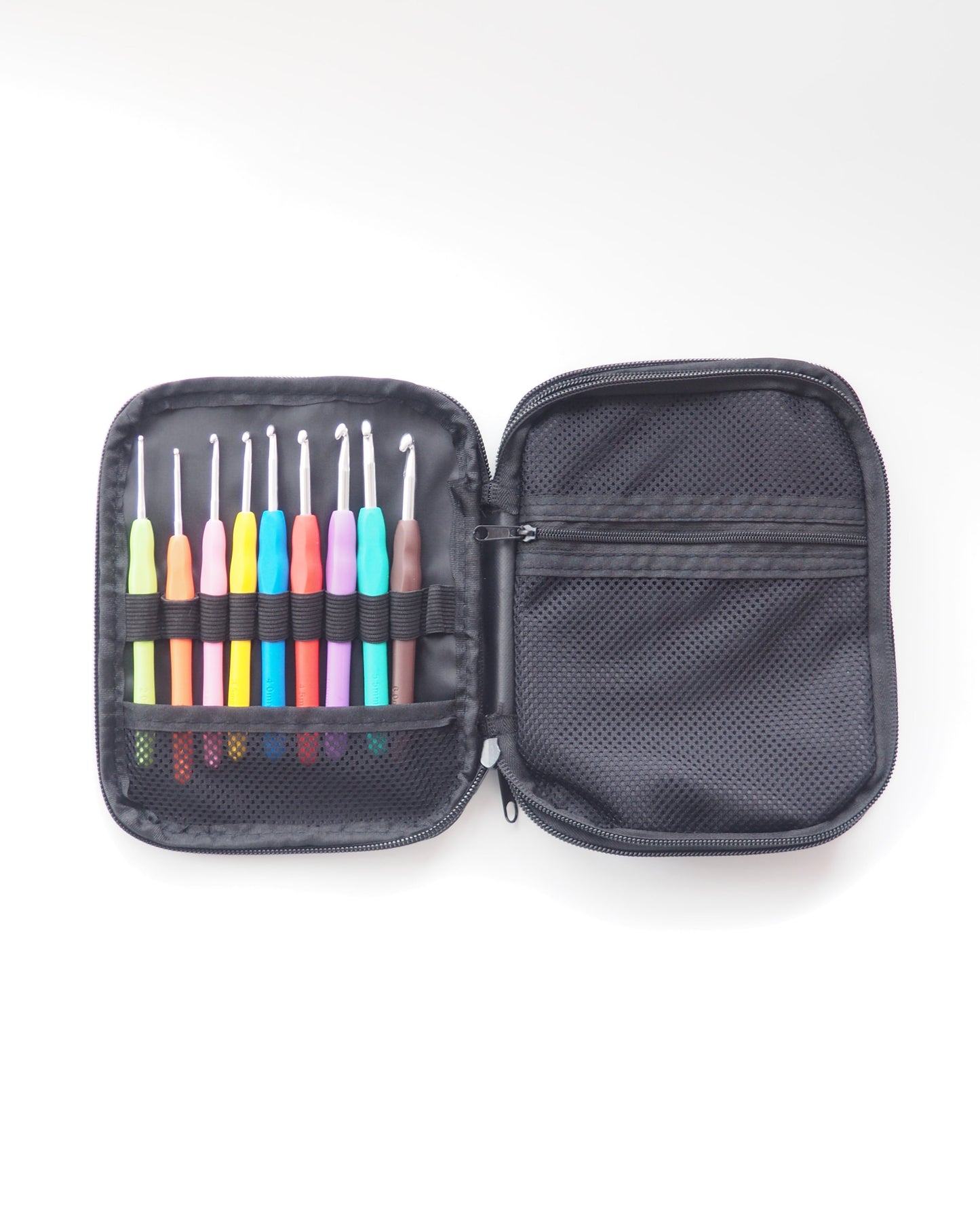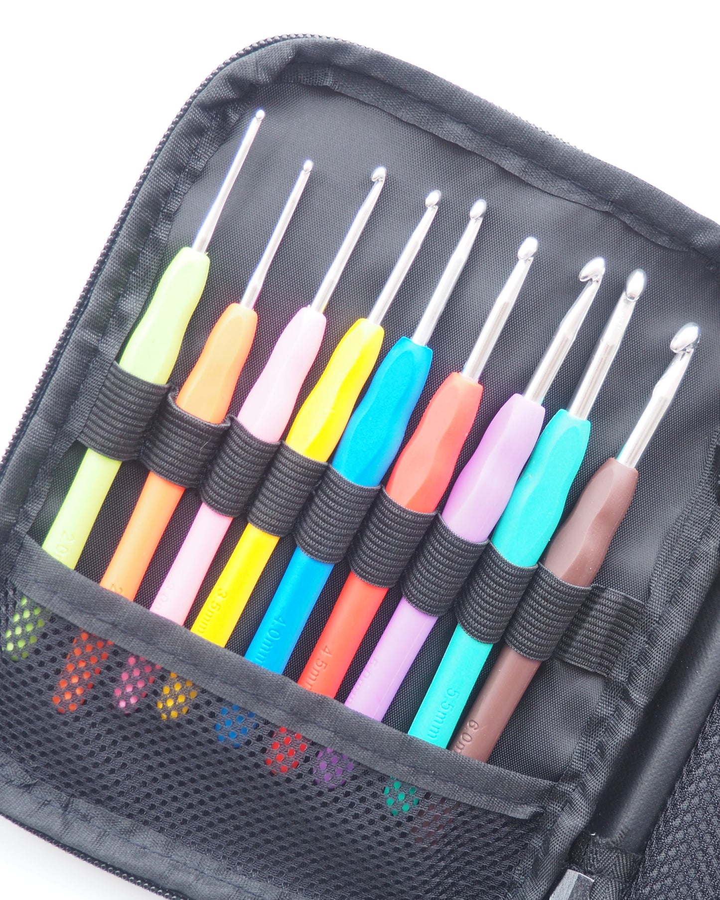 - 9 Cushioned Grip Crochet Hooks: Sizes 2mm, 2.5mm, 3mm, 3.5mm, 4mm, 4.5mm, 5mm, 5.5mm, and 6mm. Enjoy hours of comfortable crocheting with these smooth, easy-grip hooks.