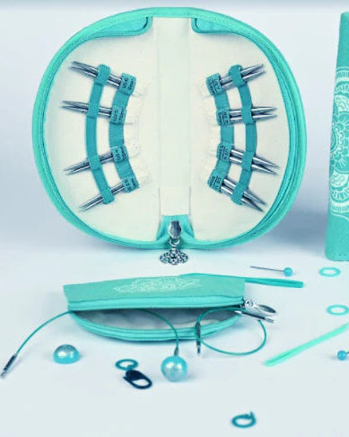 Discover precision knitting with our Mindful Mini Interchangeable Lace Needle Set. The Generosity Set of 5cm (2") interchangeable needle tips makes finishing small circumference projects easier. Perfect for cuffs, sock finishing, neckline finishing and a variety of smaller in-the-round projects. Crafted from smooth stainless steel, they effortlessly glide through your yarn. Each set includes inspirational words to foster a mindful knitting experience, helping you stay focused and calm. The interchangeable circular needles are available in smartly packaged sets of 8 needle sizes and include 4 cords and accessories. An inspirational word is printed on each set of needle tips to help you focus on the meditative benefit of your work. Elevate your knitting practice with the Mindful Mini Interchangeable Lace Needle Set. The zippered fabric case keeps your needles and accessories and is a handy size for knitting on the go. The use of teal color and floral motifs further strengthen the mindful effect on knitters.